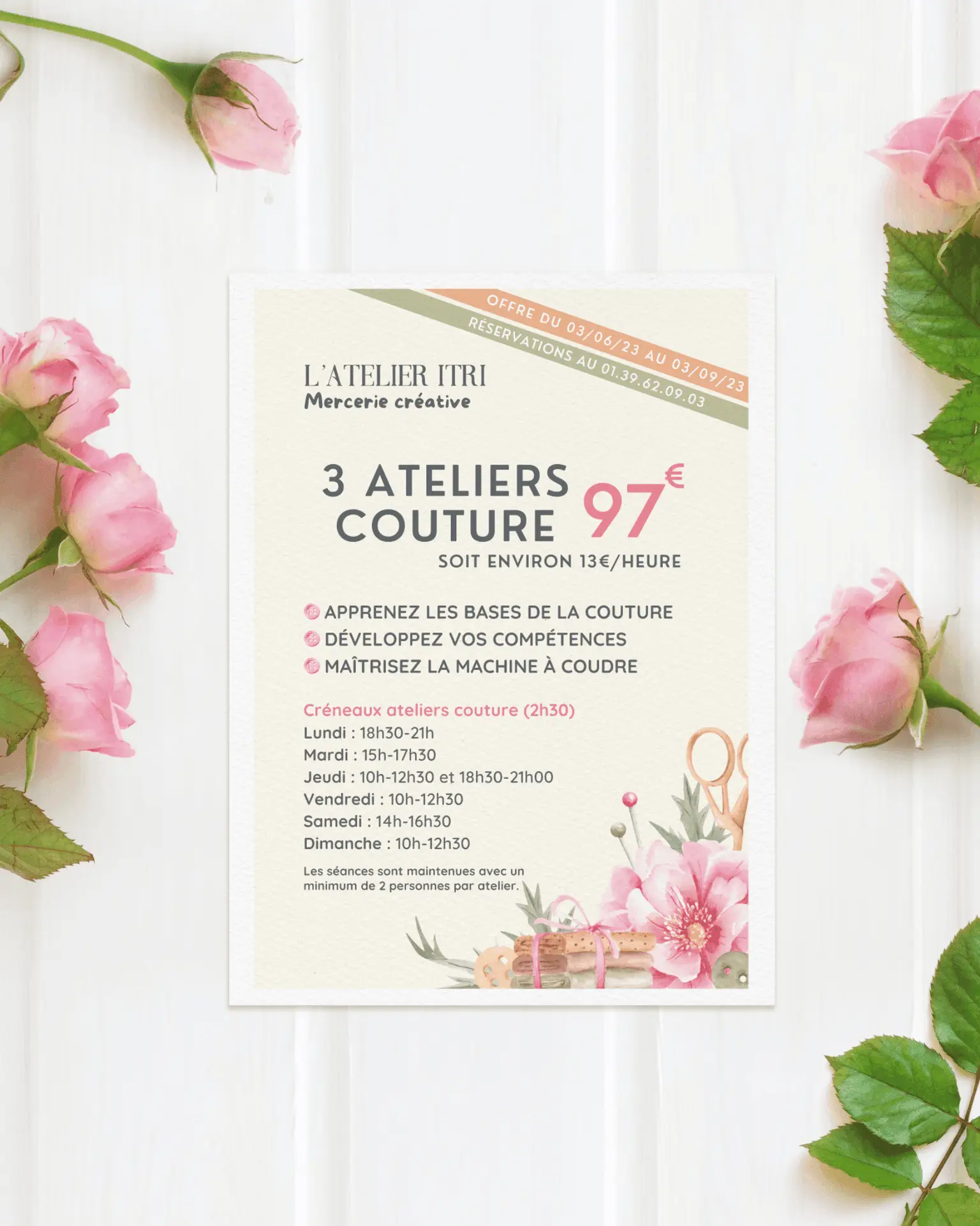 L’Atelier Itri est une mercerie créative proposant produits et ateliers artisanaux. Les ateliers incluent couture, tricot, crochet et peinture sur céramique. L’enjeu était de créer une identité visuelle pensée pour les supports imprimés. Elle devait rester lisible, élégante et cohérente avec l’univers du lieu.